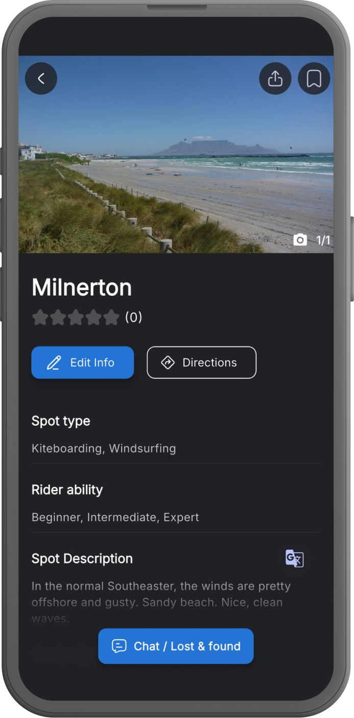 Each spot in the app is associated with its own chat group. This allows users to exchange information, ask questions and coordinate with others at the same location. Typical use cases include sharing local conditions, spot-specific advice or logistics.