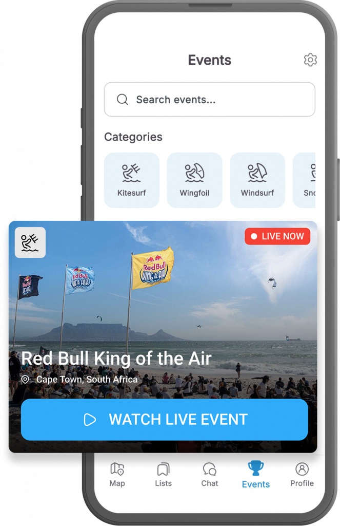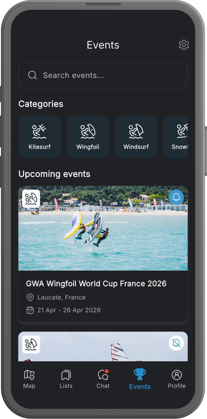 Never miss a kiteboarding, wingfoiling, or windsurfing Event. Get instant notifications, stay up to date and be part of all the action!