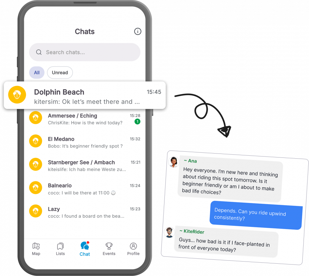 Say goodbye to other chats groups - CHAT where you RIDE! Share conditions, plan sessions and connect with local riders. Unsure about the spot? Lost or found gear? Just ask in the chat.